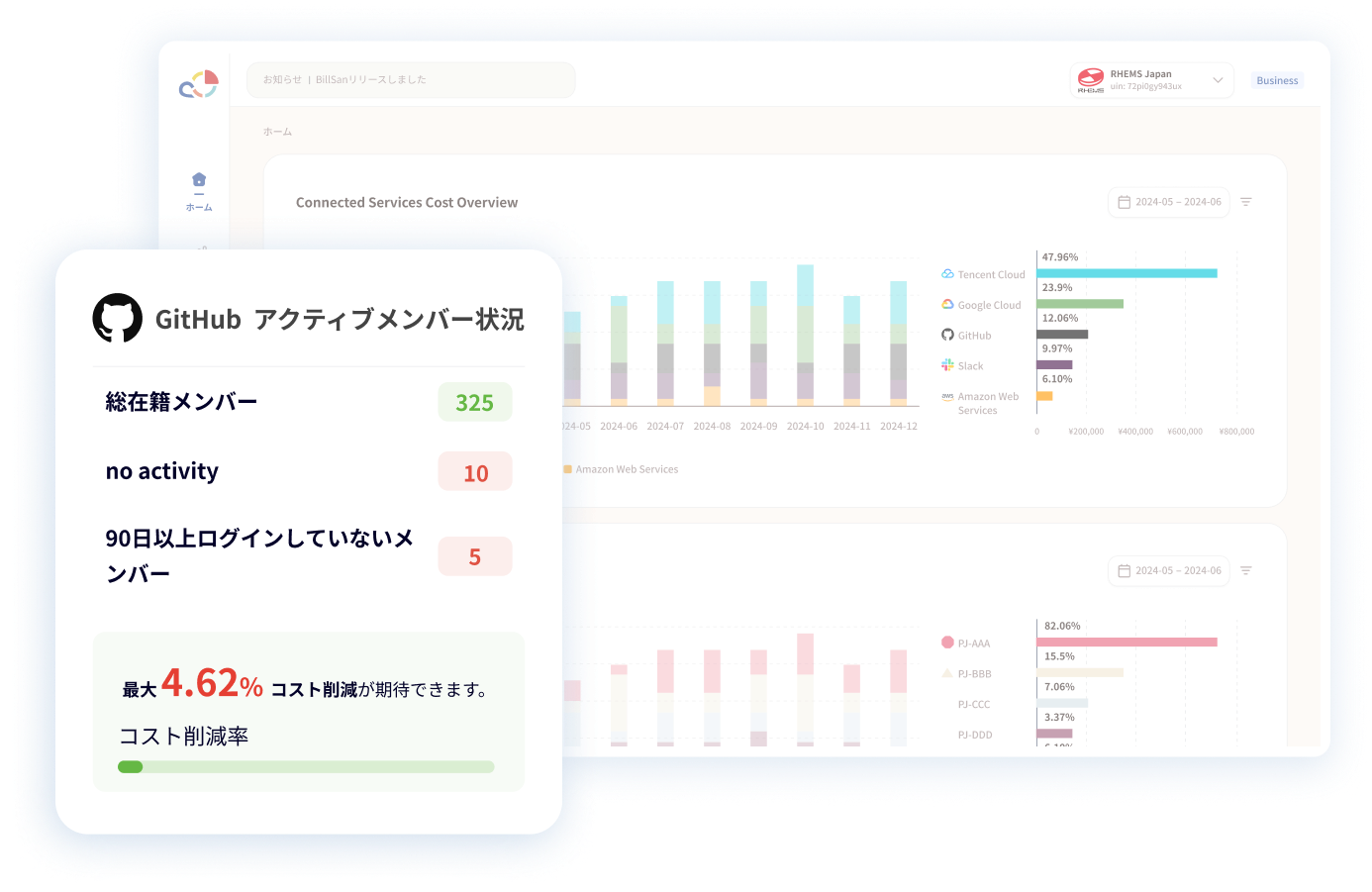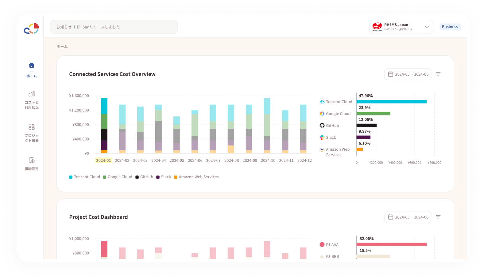 BillSanは、クラウドシステムにかかるコストの把握・分析を容易にし、プロジェクト運営に関わるメンバー全員が現状を把握できるようになるためのプラットフォームです。各部門間の相互協力で最適なクラウド利用を可能にします。